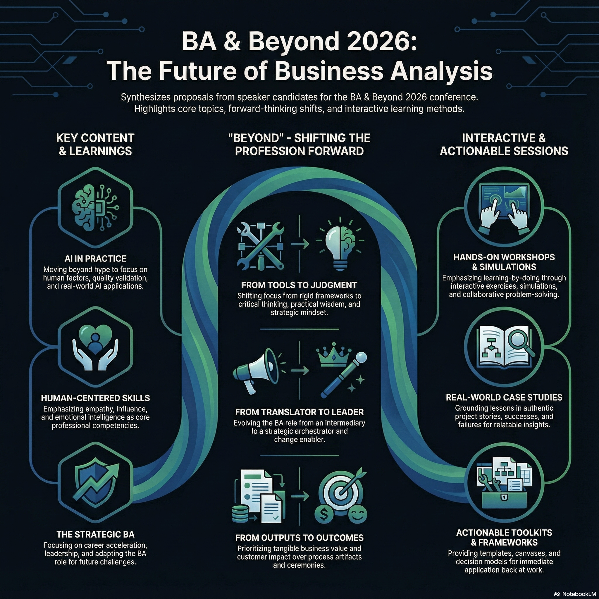 The concept of "beyond" is defined as transcending the traditional role of requirements gathering to embrace strategic leadership and psychological depth, moving past theoretical frameworks to address the "messy" reality of human behavior, failure, and organizational politics, while actively shaping the ethical and practical integration of AI rather than just reacting to it.